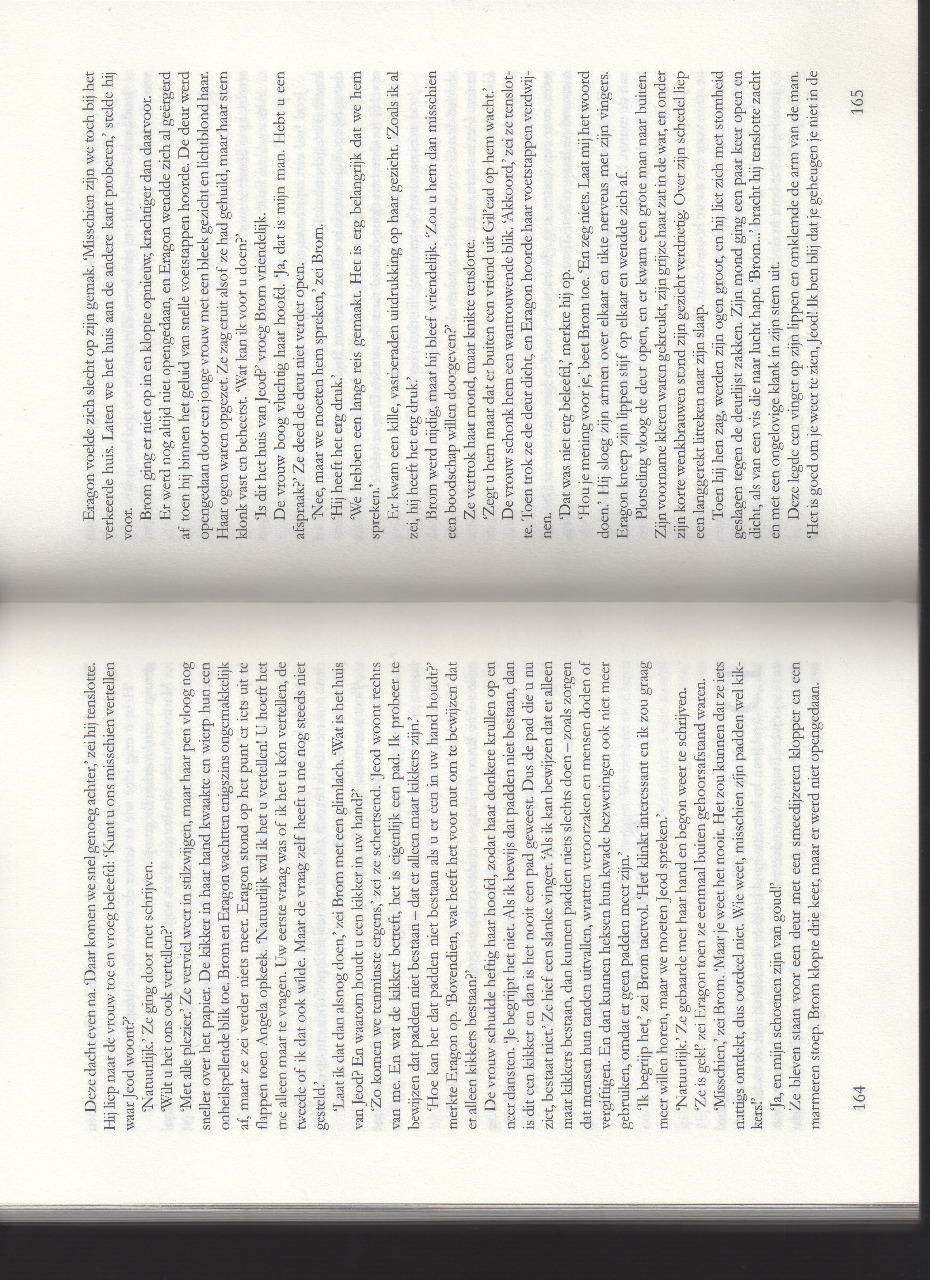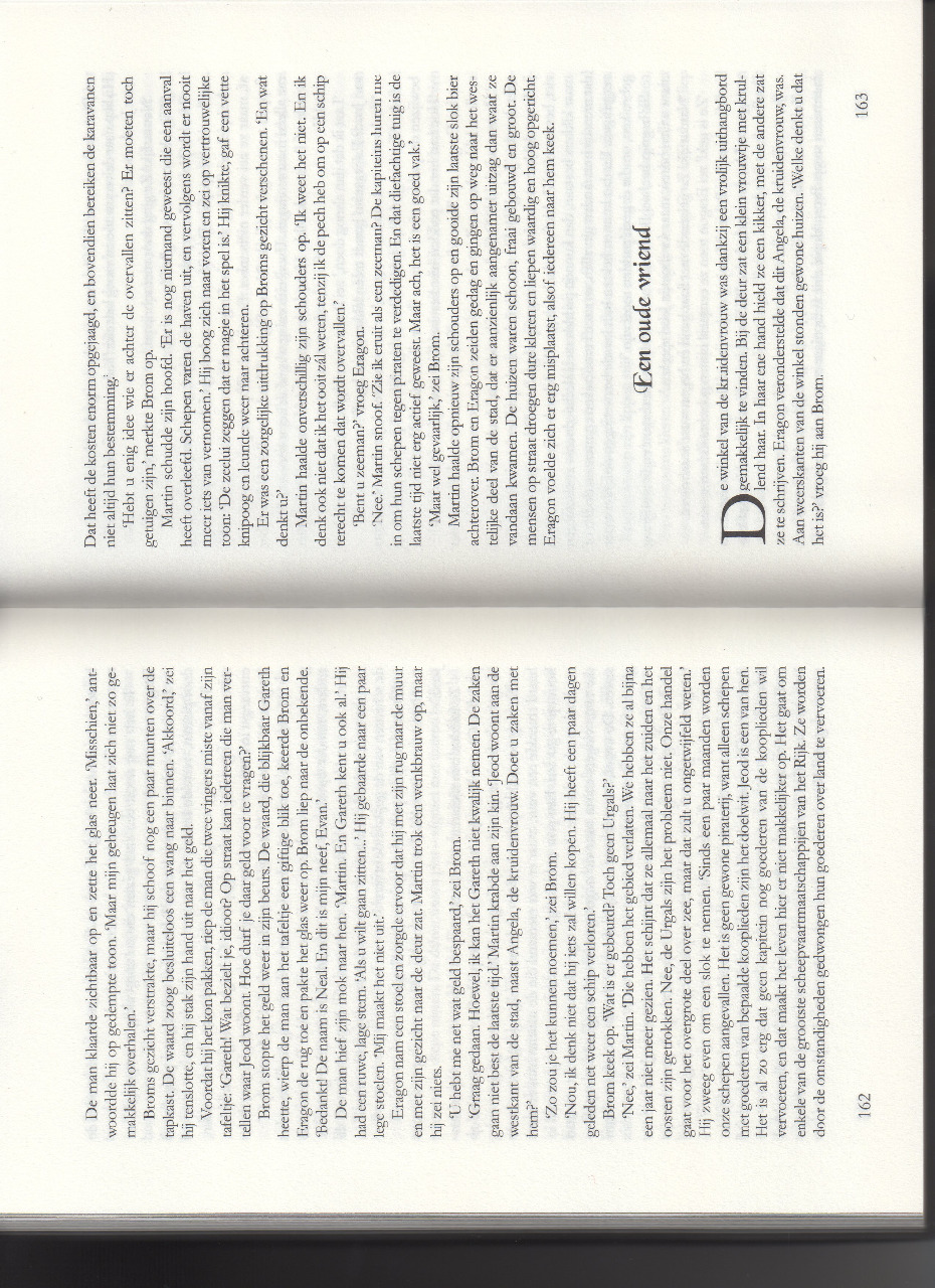 ‘Natuurlijk.’ Ze gebaarde met haar hand en begon weer te schrijven. Met een stevige wandelpas wandelde ik tot achter het hoekje. Nadat Brom en Eragon hun achterstand hadden ingehaald, keken we elkaar glimlachend aan. ‘Die vrouw is gek!’ zei Eragon.